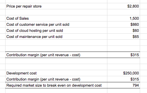 Cost of acquiring a lead, how much time will you need to call or write personalised emails to your potential customers? Will you have a senior sales person with a roller deck of enterprise CIO's? What's the cost per click and the conversion assumption?