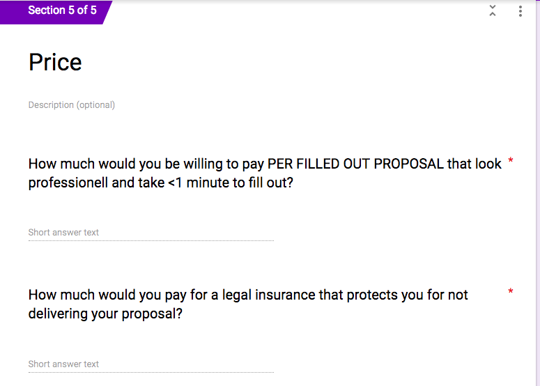 As we have discussed upfront - the price is the indicator whether the problems you have identified can actually be solved. You need two inputs to ask this well: the unit of the product (on-time vs. subscription vs. per unit of problem solved) and the price. This depends intrinsically on what you plan to build.