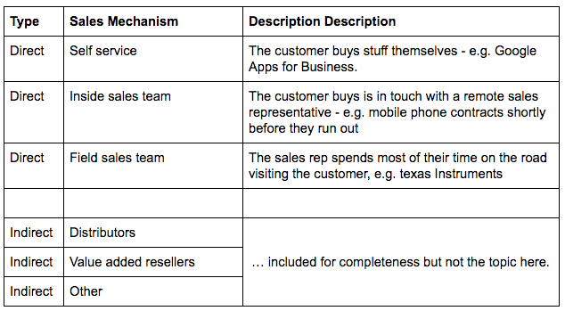 Direct sales (where you can engage with the customer directly) are divided into self service, inside sales team and a field sales team.