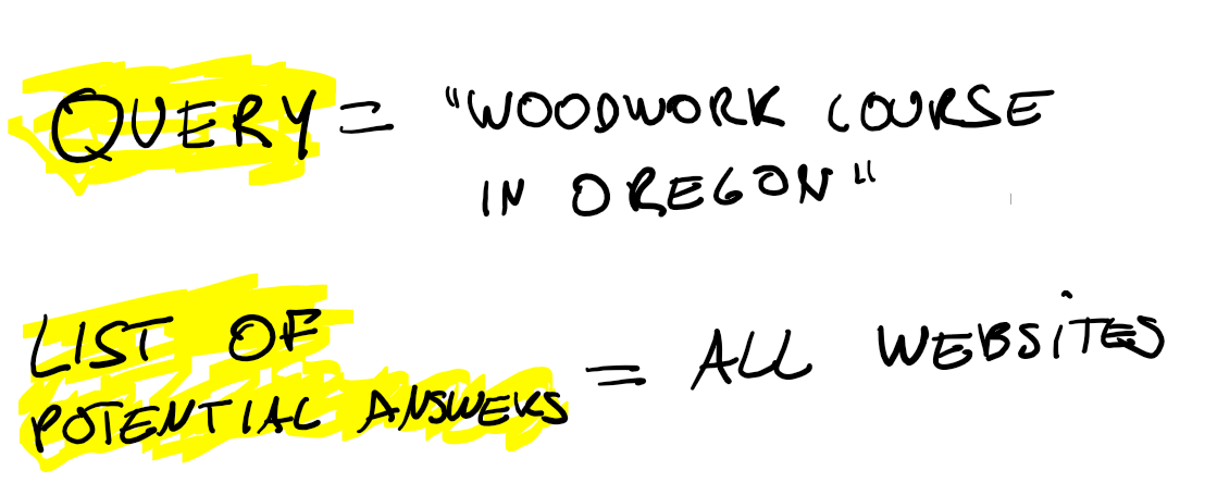 Now, as the web matures users start to know that there is probably content out there, the problem becomes finding it. Compare this: looking up “woodwork” in a list of hobbies fairly fast and pleasurable for a human, finding an article on “the best courses on woodwork in Oregon” is no longer something works in a list. Should I look at the list for courses, or the list for Oregon or the list for woodwork?