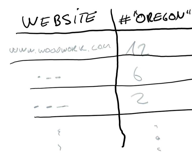 Basically a table that contains a list of how often “oregon” appears on a certain website. Now you search algorithm might breaks apart the input, notices that the user ask for something containing oregon and generate a ranking of websites based on this algorithm: