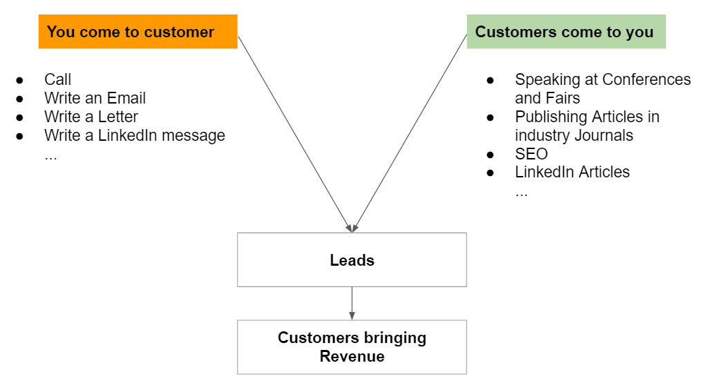 You need to get people interested and qualified to buy your product or do a transaction (if you are a marketplace) or whatever it is that makes the revenue. You have to strategies: people come to you or you mtry to make them come to you.